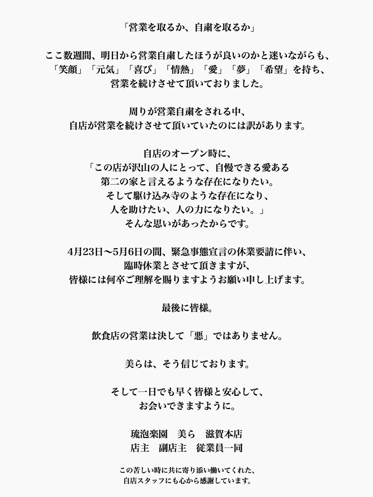 ここ数週間、明日から営業自粛したほうが良いのかと迷いながらも、「笑顔」「元気」「喜び」「情熱」「愛」「夢」「希望」を持ち、営業を続けさせて頂いておりました。