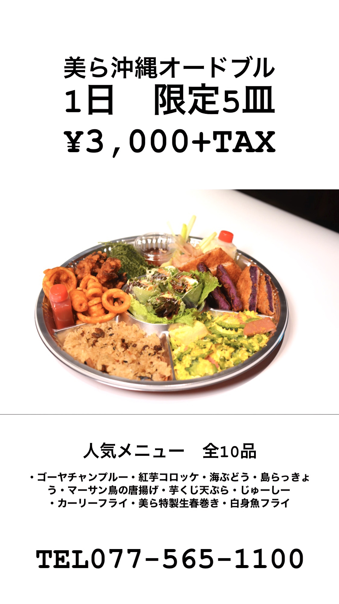 内容 ・ゴーヤチャンプルー・紅芋コロッケ・海ぶどう・島らっきょう・マーサン鳥の唐揚げ・芋くじ天ぷら・じゅーしー・カーリーフライ・美ら特製生春巻き・白身魚フライ