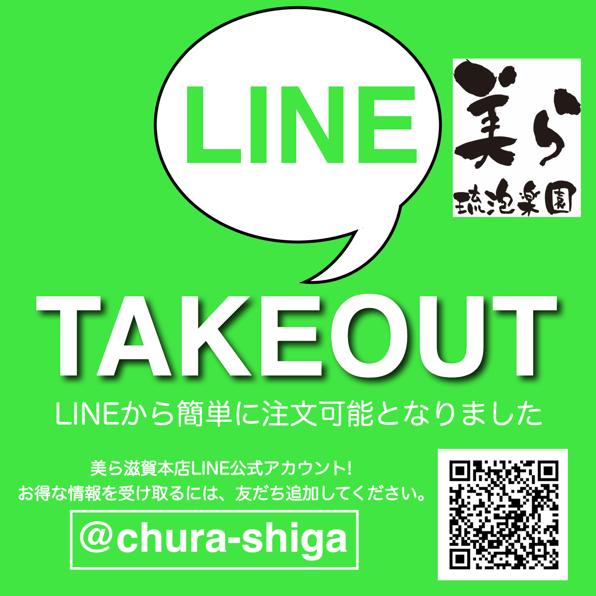 「美ら滋賀本店」のトーク画面を開いて頂き、ライントークに[1.名前 2.電話番号 3.お持ち帰り日時 4.受取希望時間 5.お持ち帰りのメニュー内容]を記載して頂き送信するだけです。