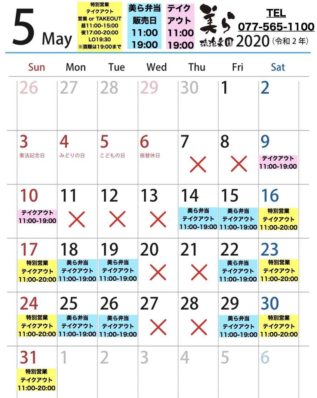 特別営業日&テイクアウトデーのお知らせ。お弁当販売日もあります。